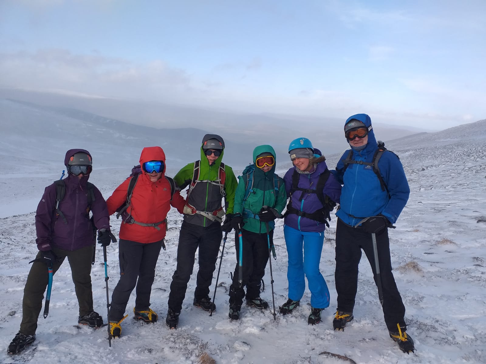 Having covered some of this indoors we headed up to the Aviemore Ski area with a planned route in mind and practiced some simple navigation skills to get going. We soon found that we were at freezing level at around 600m, just as forecast, and so our first time putting crampons on in anger to safely walk up the frozen path.