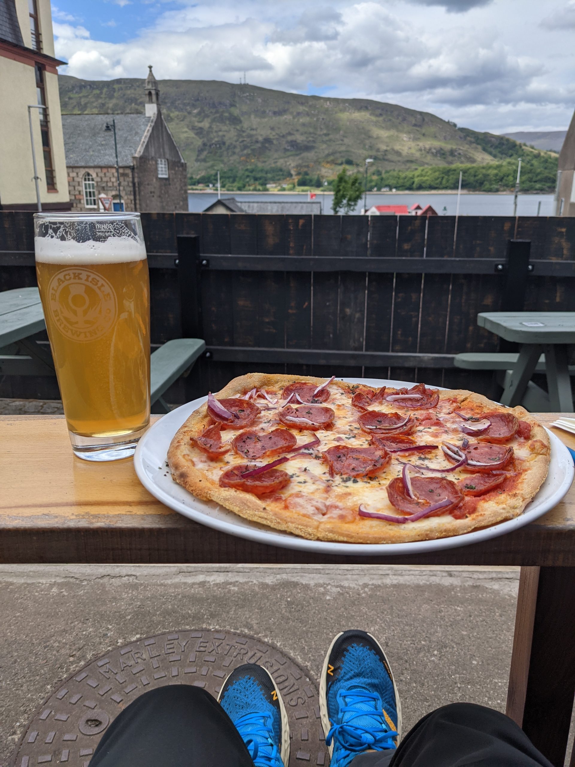 Shopping done, we had pizza and beers, at the Black Isle Brewery bar here in Fort William. We stayed in the Black Isle Brewery bar/hotel in Inverness the night before we started at JOG so seemed fitting, and their pizzas, ciders, and beers are spot on! We both got the chorizo pizza and packed a couple of slices away for tomorrow’s lunch. The final task was to post a few things back home including the shoes I’ve been using this far (they have plenty of mileage left in them) and, of course, my antler!