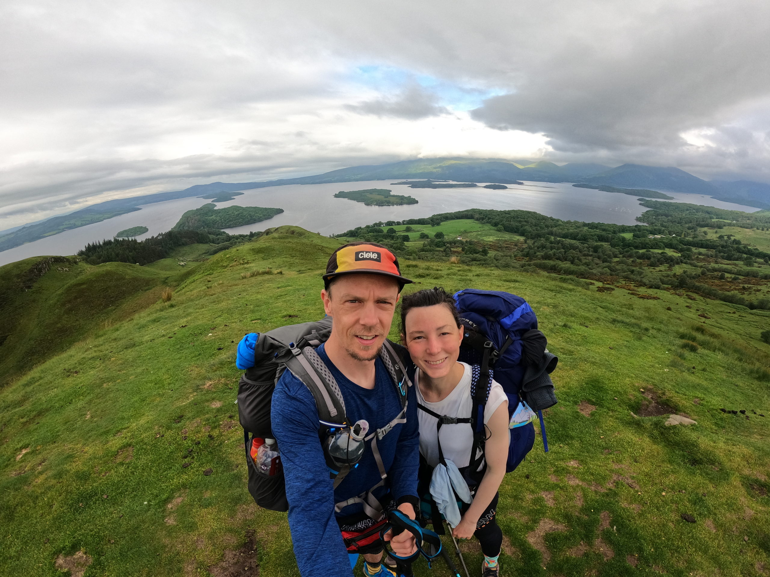 We hit the trail just after 0700 knowing we had a bit of a lump to climb over and around 15km to a Sunday Roast at the Clachan Inn in Drymen. We continued where we left off yesterday following the edge of the loch, until heading east and starting the climb up Conic Hill. We were now among not only other WHW hikers, but also the day hikers too. There was a lot of huffing and puffing. Not from us though. We made our way slowly up and stopped to take a few pictures looking back over Loch Lomond. The cloud had lifted just about in time and it was a view to savour for a few minutes!